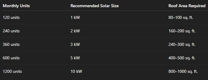 Divide your monthly units by 120. For example, 240 units require approximately a 2 kW system.